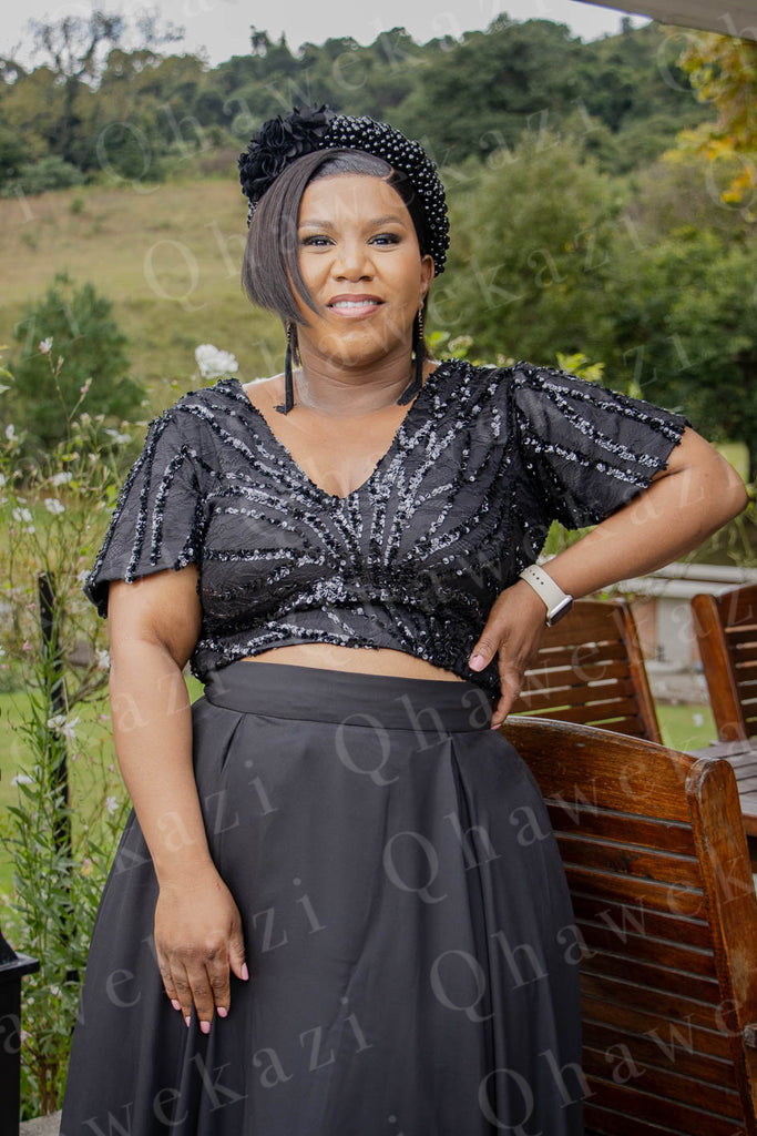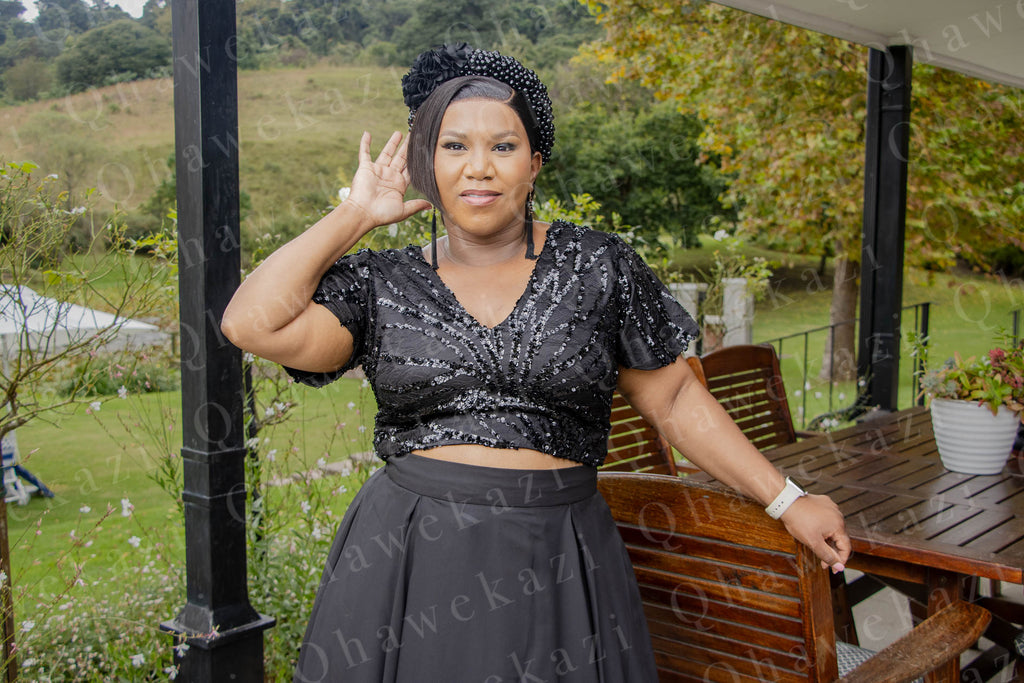 A stunning black sequin crop top designed to make a bold yet elegant statement.