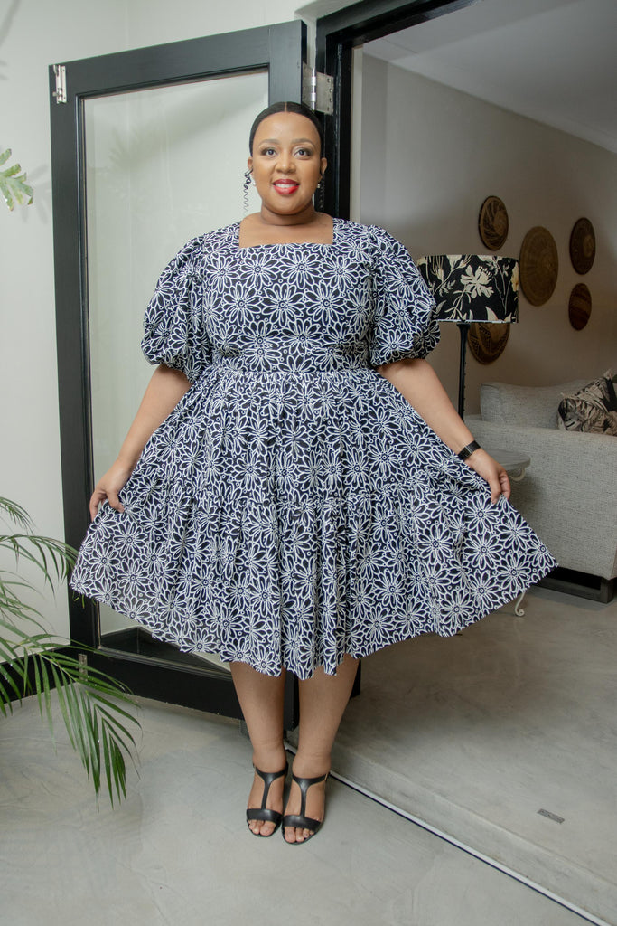 A charming knee length dress crafted in a black and white floral fabric, creating a timeless and sophisticated look.