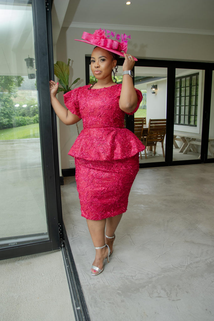 A chic and sophisticated magenta peplum dress crafted with intricate floral lace detailing and a fitted silhouette.